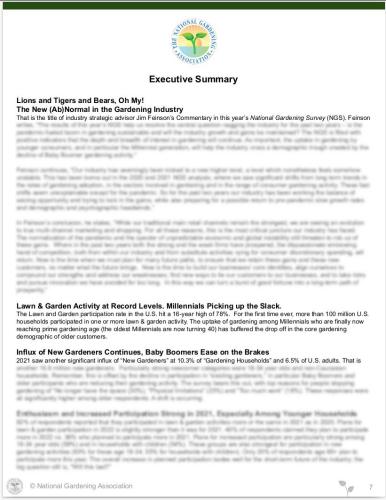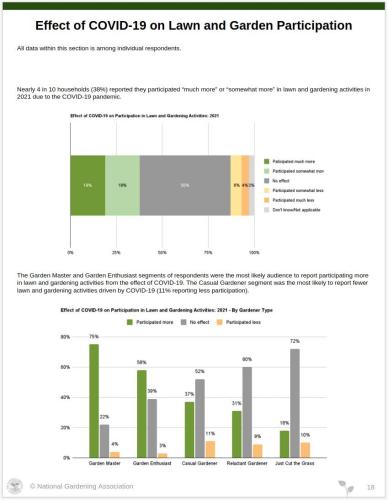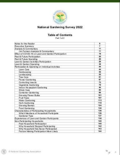 The 2022 National Gardening Survey is the comprehensive market research report that leaders in the lawn and garden industry count on each year to track the market and help them make strategic marketing decisions. Conducted annually since 1973, the Survey provides in-depth and up-to-date marketing information on industry trends, household participation, consumer profiles, gardeners' attitudes, and retail sales.