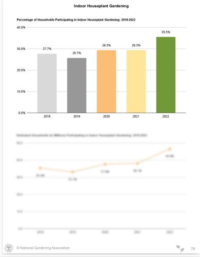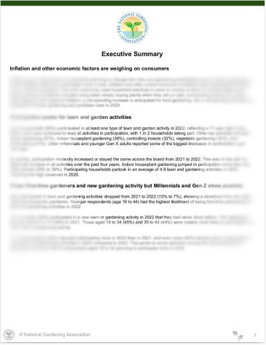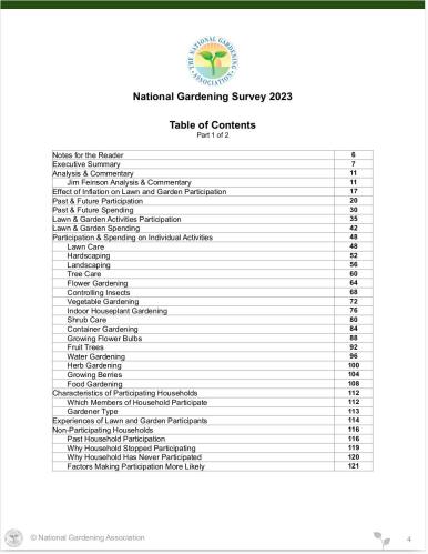 The 2023 National Gardening Survey is the comprehensive market research report that leaders in the lawn and garden industry count on each year to track the market and help them make strategic marketing decisions. Conducted annually since 1973, the Survey provides in-depth and up-to-date marketing information on industry trends, household participation, consumer profiles, gardeners' attitudes, and retail sales.