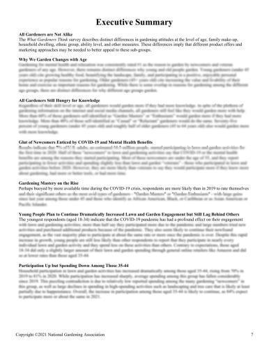 This unique report reveals important information about the types of gardeners in America, their attitudes, and what motivates them. Our original study provides detailed, factual data that will help leaders in the lawn and garden market make strategic marketing decisions. Our updated survey includes the following topics:
